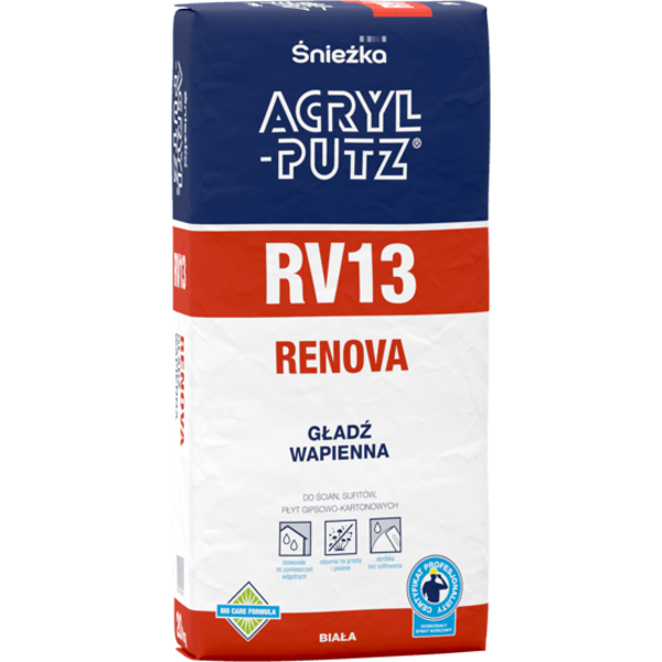 ACRYL-PUTZ® RV13 RENOVA jest mieszaniną specjalnie wyselekcjo- nowanych kruszyw, białego cementu, mączki wapiennej, wapna hydratyzowanego oraz dodatków i domieszek. Charakteryzuje się dobrą urabialnością i łatwą aplikacją. Idealna do wykonywania gładzi bez potrzeby szlifowania. Polecana do pomieszczeń suchych i wilgotnych. Gwarantuje uzyskanie gładkiej powierzchni gotowej do malowania lub tapetowania.