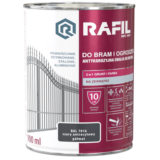 Antykorozyjna Emalia RAFIL DO BRAM I OGRODZEŃ przeznaczona jest do ochronno-dekoracyjnego malowania powierzchni metalowych: stalowych, ocynkowanych i aluminiowych eksploatowanych na zewnątrz pomieszczeń. Tworzy trwałą i elastyczną powłokę odporną na uderzenia. Charakteryzuje się zwiększoną odpornością na działanie trudnych warunków atmosferycznych. Zapewnia długotrwały efekt dekoracyjny malowanych powierzchni, a w zestawieniu z Rafil PODKŁAD ANTYKOROZYJNY stanowi silne zabezpieczenie przed korozją