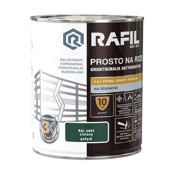 RAFIL PROSTO NA RDZĘ to specjalistyczna gruntoemalia 3w1 stosowana bezpośrednio na powierzchnie stalowe i żeliwne eksploatowane na zewnątrz. Ta łatwa w aplikacji, szybkoschnąca farba charakteryzuje się doskonałą przyczepnością i dobrym kryciem. Dzięki niezwykle trwałej i elastycznej powłoce doskonale chroni powierzchnie metalowe przed szkodliwymi warunkami atmosferycznymi i przed korozją. Właściwości farby zostały potwierdzone Krajową Oceną Techniczną.