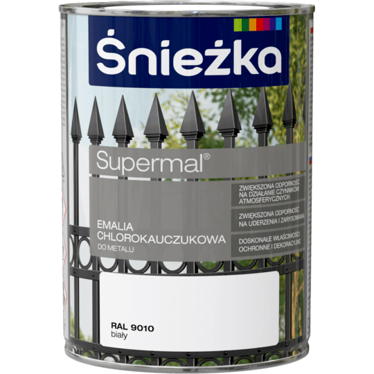 SUPERMAL® Emalia chlorokauczukowa zalecana jest do dekoracyjno-ochronnego malowania elementów stalowych i żeliwnych eksploatowanych na zewnątrz pomieszczeń, szczególnie narażonych na działanie czynników atmosferycznych takich jak: konstrukcje budowlane, ogrodzenia, balustrady, urządzenia mechaniczne itp. Może być stosowana także do dekoracyjnego malowania podłoży betonowych i tynków cementowo-wapiennych nie narażonych na ścieranie. Zwiększona odporność na działanie czynników atmosferycznych. Zwiększona odporność na uderzenia i zarysowania. Doskonałe właściwości ochronne i dekoracyjne.