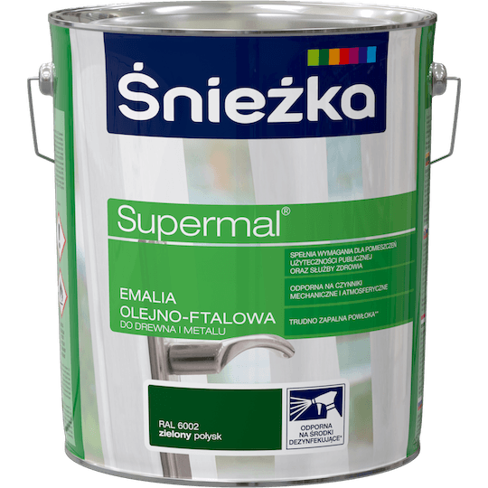 SUPERMAL® Emalia olejno-ftalowa stosowana jest do dekoracyjno-ochronnego malowania drewna, materiałów drewnopochodnych, tynków oraz elementów stalowych i żeliwnych użytkowanych wewnątrz i na zewnątrz pomieszczeń, takich jak: okna, drzwi, meble, ogrodzenia, lamperie itp. Polecana do stosowania w pomieszczeniach mieszkalnych, przeznaczonych na stały pobyt chorych w budynkach służby zdrowia oraz przeznaczonych na stały pobyt dzieci i młodzieży w budynkach oświaty, a także w pomieszczeniach przeznaczonych do przechowywania produktów żywnościowych (bez bezpośredniego kontaktu z żywnością).